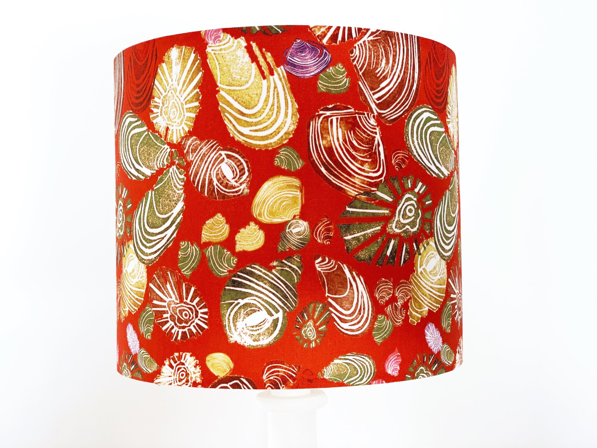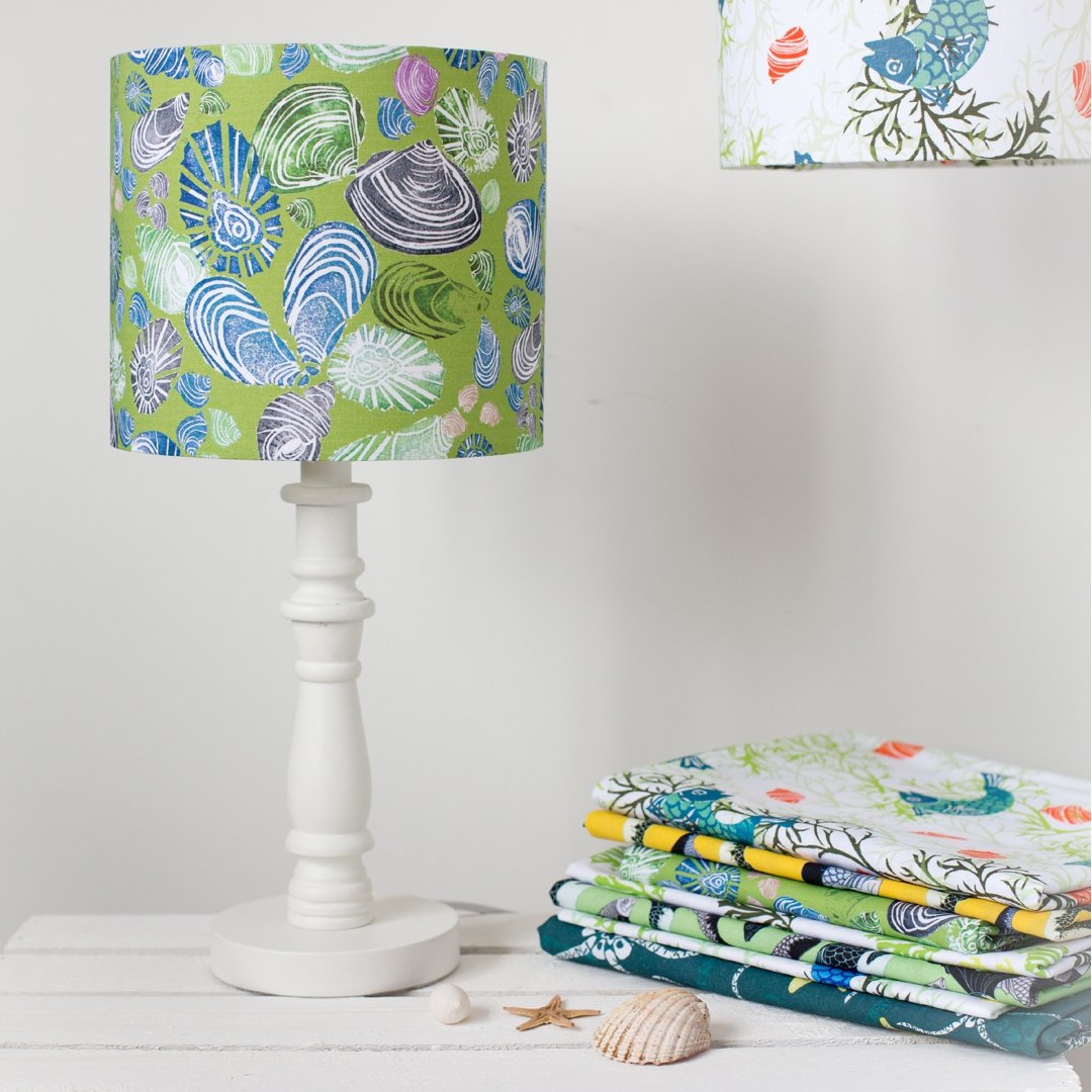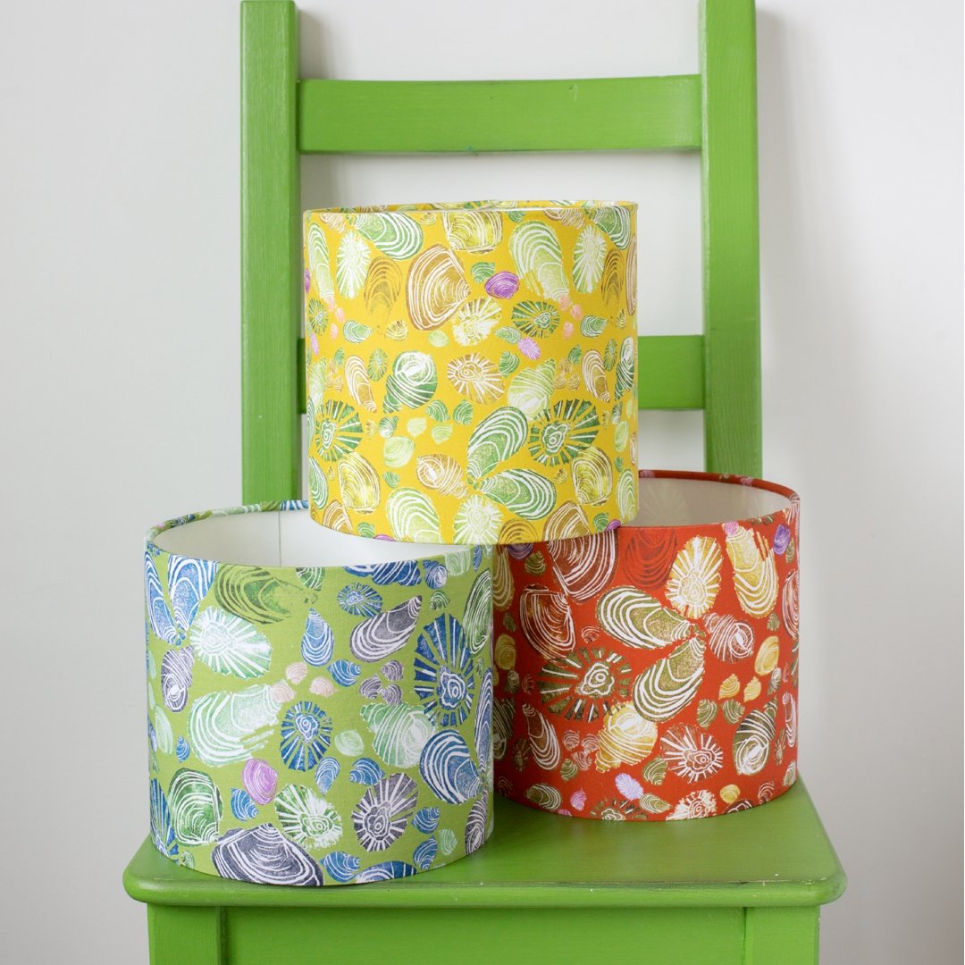 Make a statement with this beautiful handmade lampshade featuring Kate & Kelpie's best selling Scottish Seashell linocut print. Full of uplifting colour, this vibrant design is inspired by many happy hours searching for treasures on the white sandy beaches across northwest of Scotland and the Western Isles.